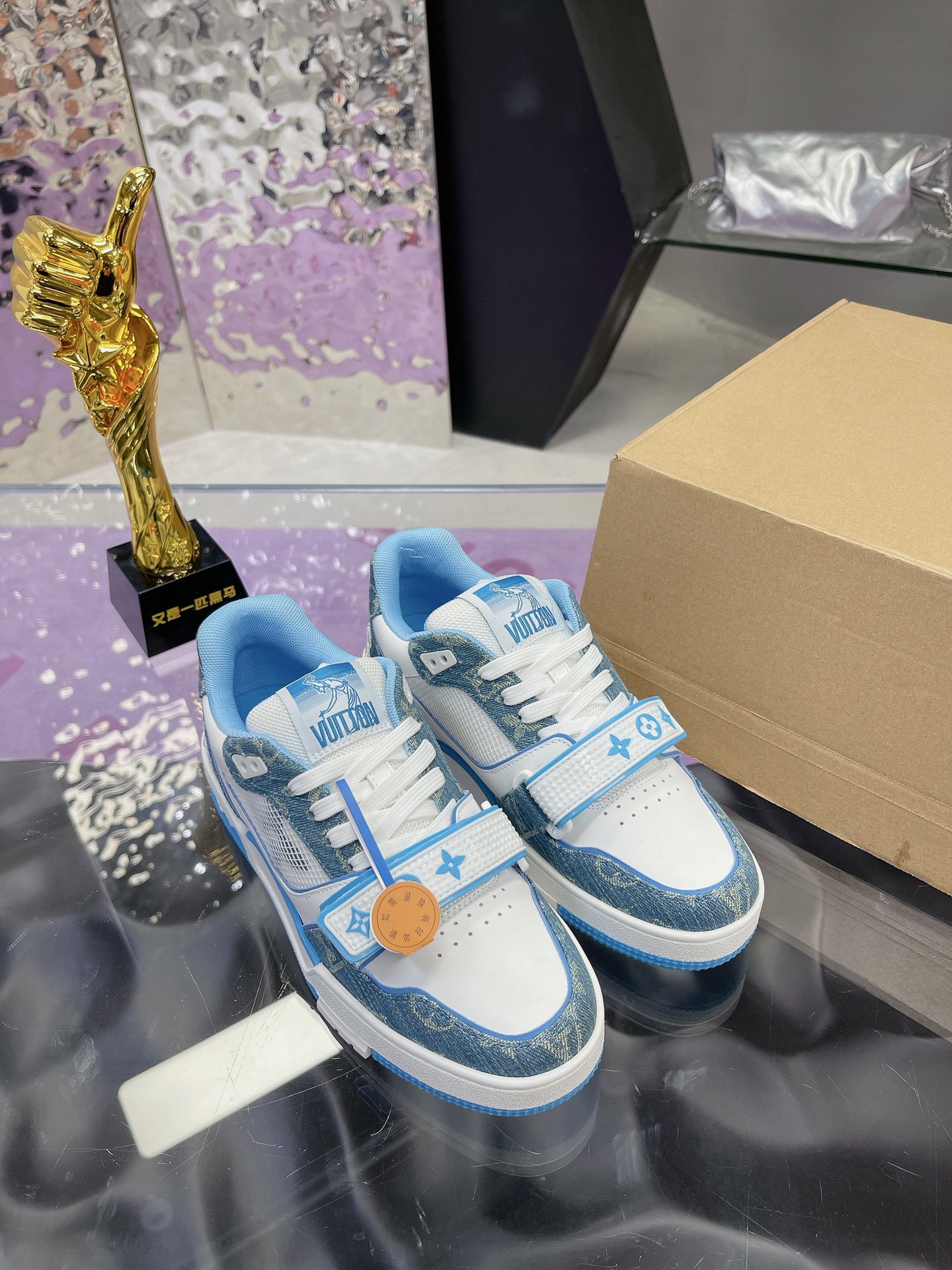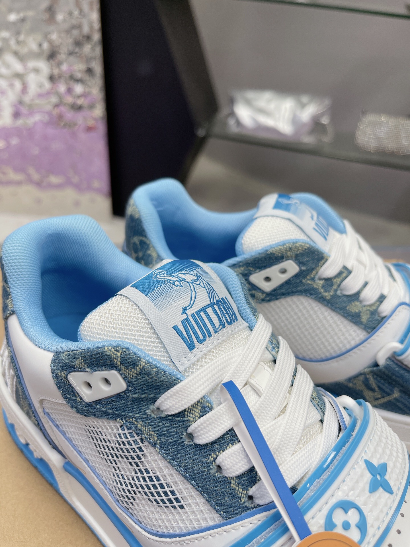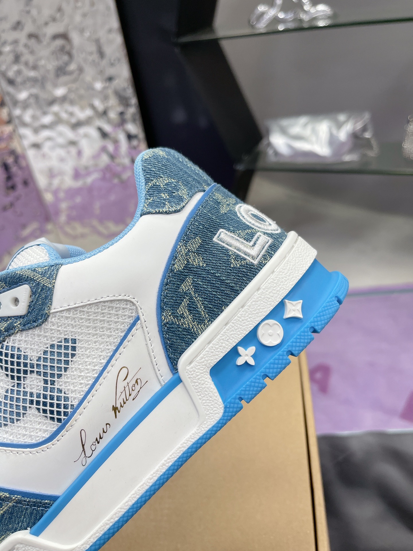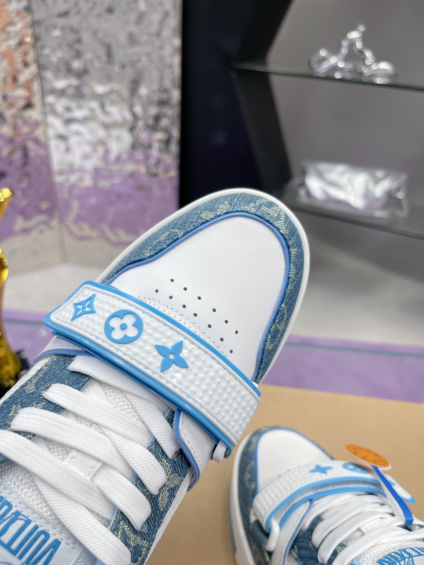 LOUIS VUITTONトレイナーレザーフラワー柄おしゃれなボードシューズメンズブルーホワイト